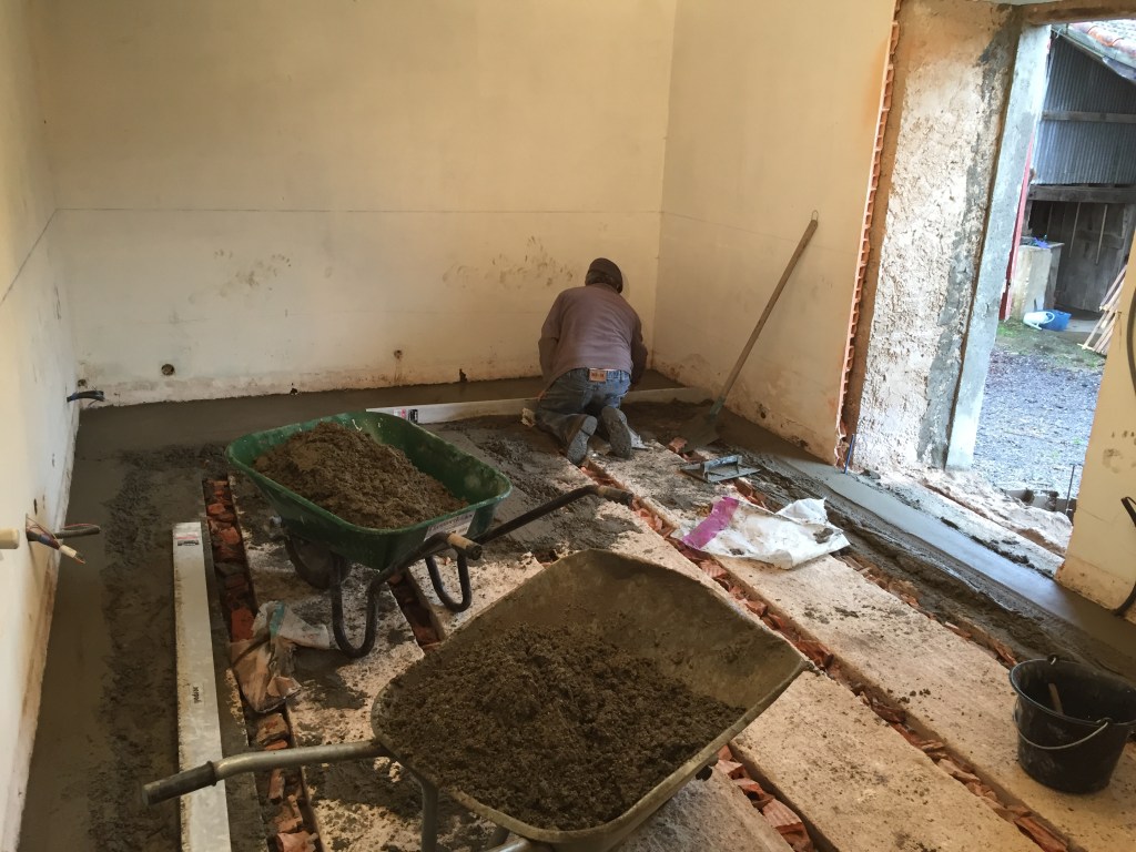 Deuxième chape… le chef de chantier manque de rythme, les brouettes s’impatientent !