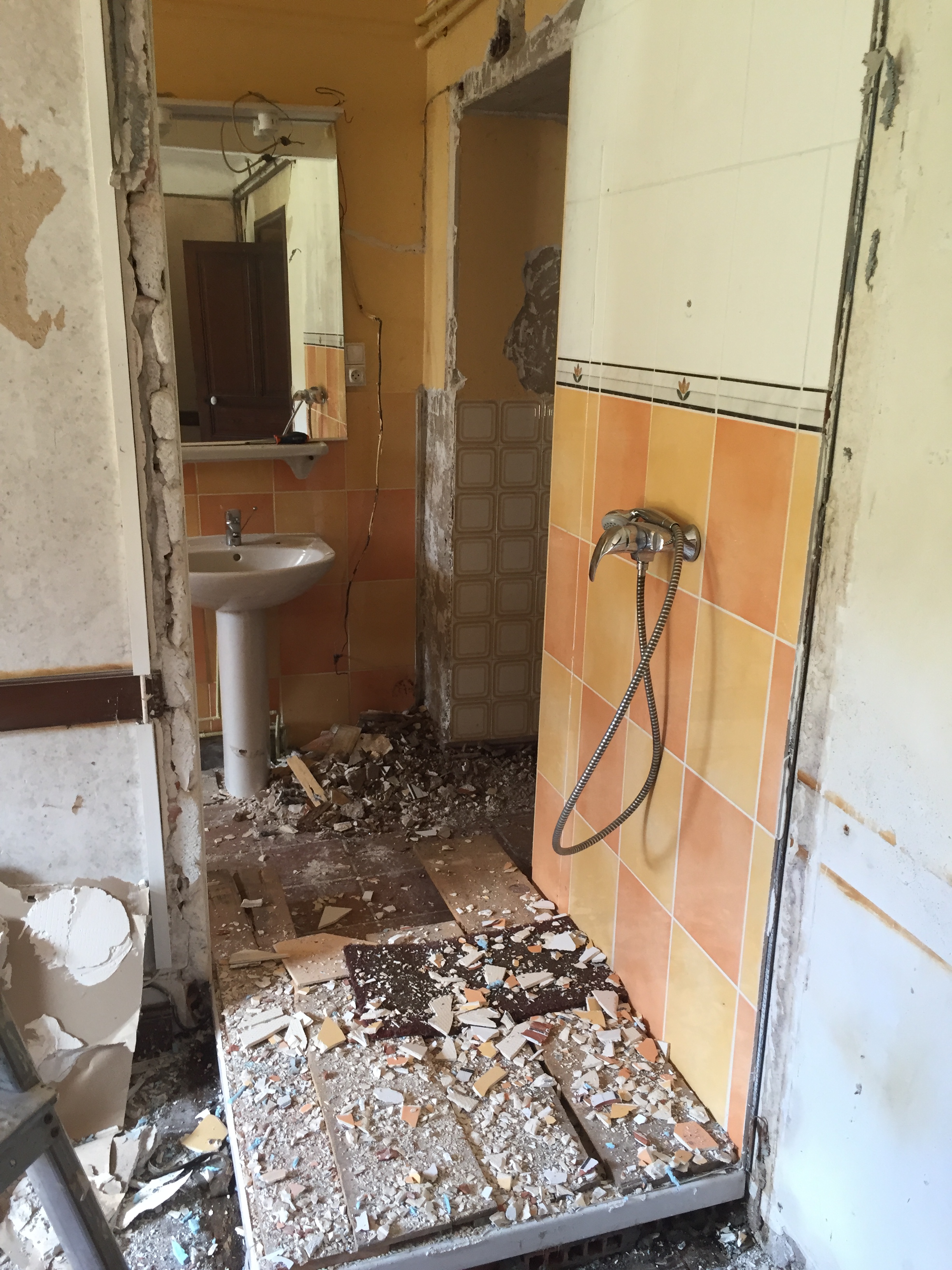 Il est vrai que lorsqu’il a fallu commencer, par quelque part, à l’intérieur de cet immense chantier, nous nous sommes demandés par quel bout attaquer ce mastodonte !? Démolir ce qui était pourri par l’humidité et l’abandon… Oui, mais où mettre le premier coup ! Une massette à la main, une pointerrole dans l’autre, nous errions dans cette immensité, à la recherche du début, du commencement…