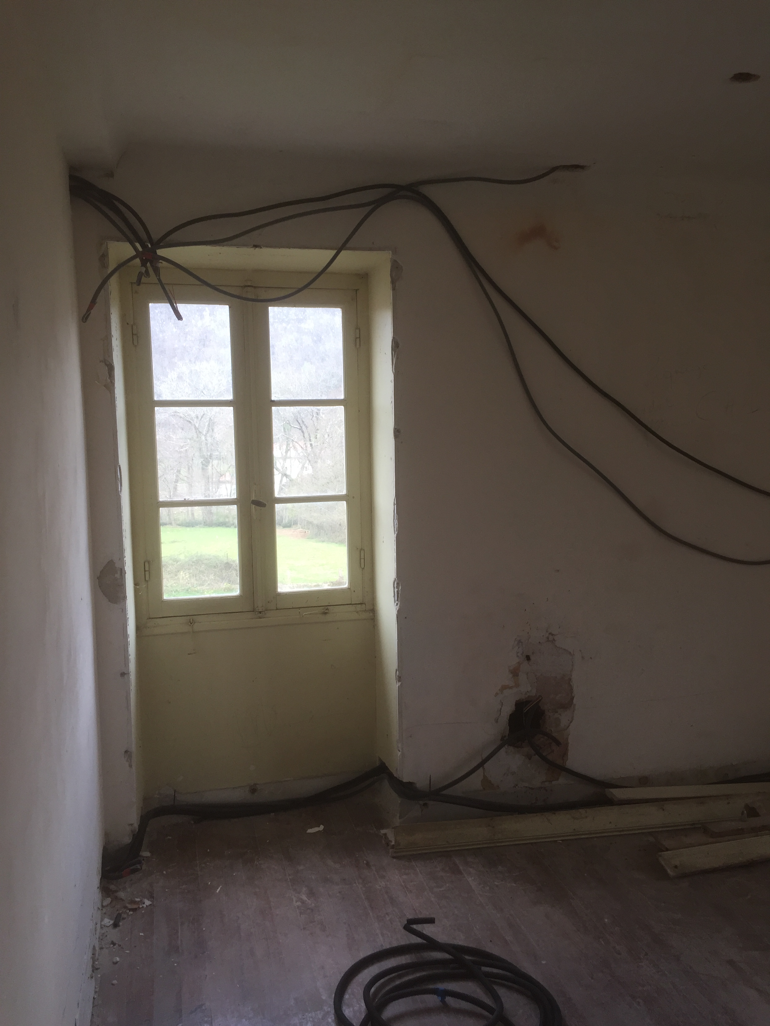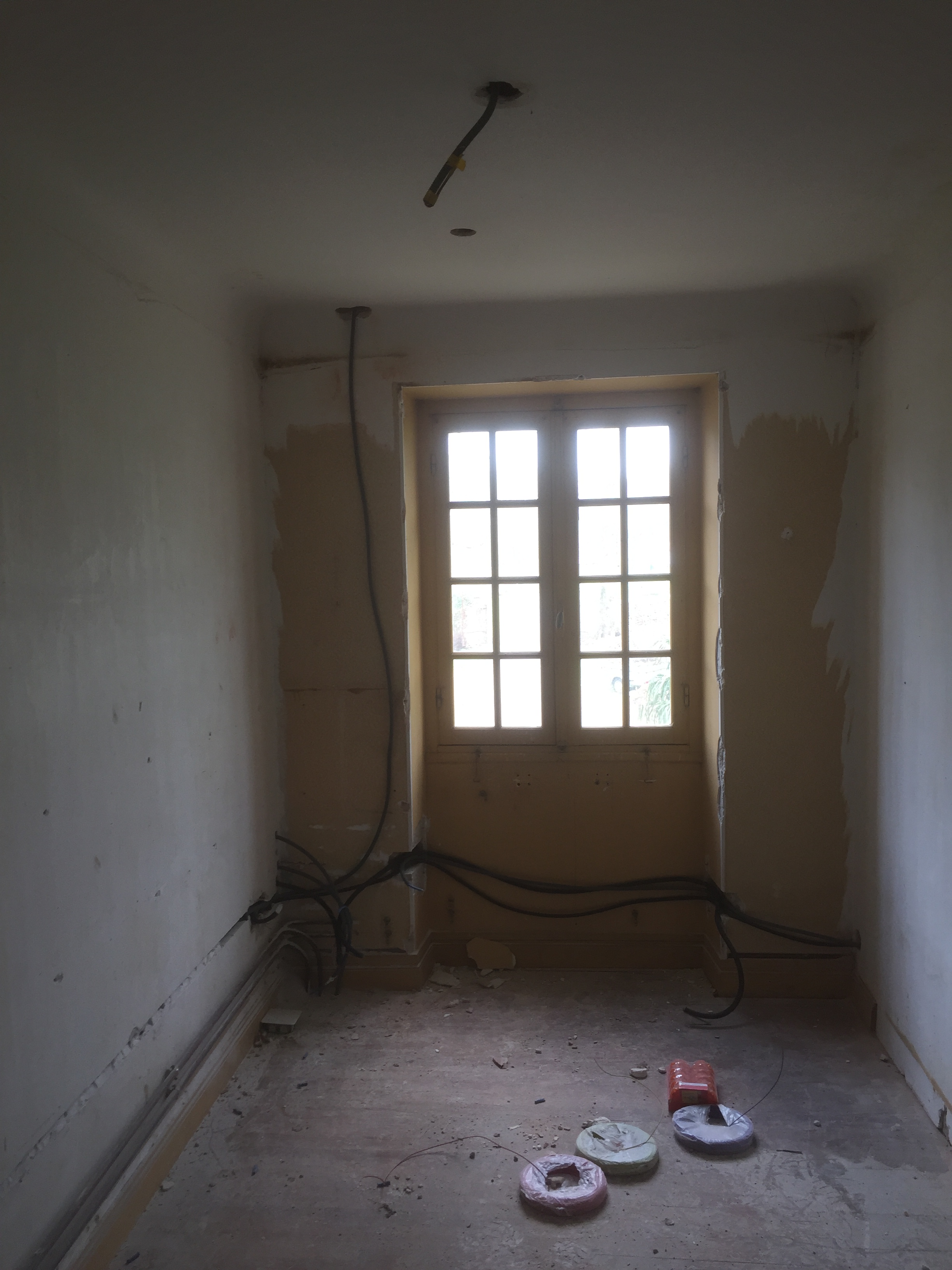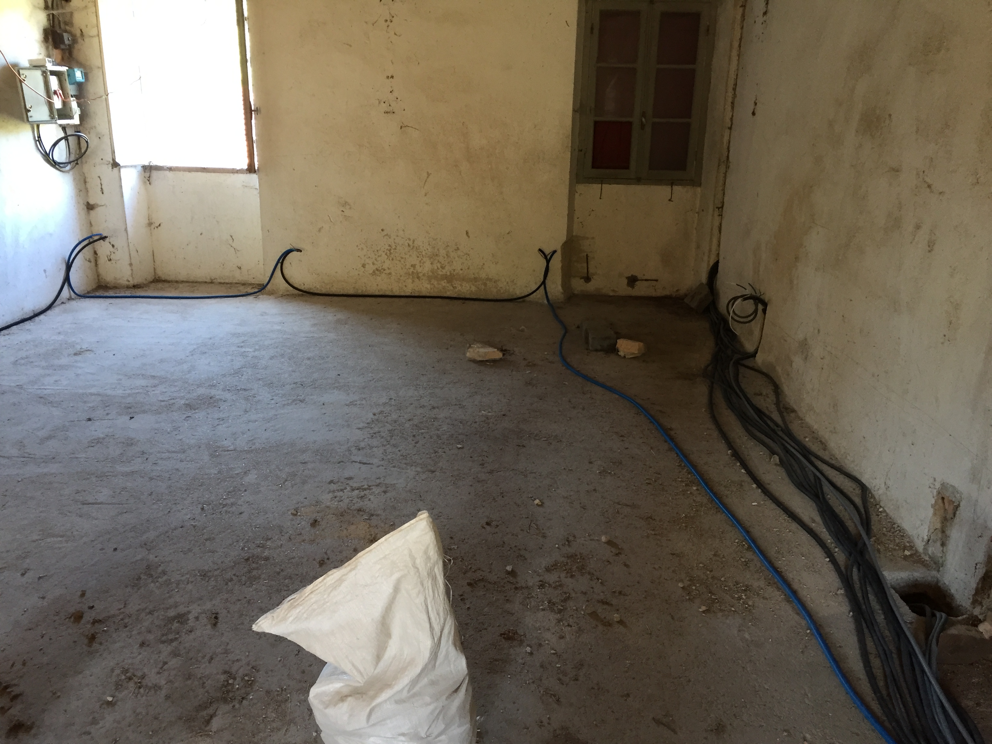 Maintenant que l’électricité est tirée dans les chambres, il faut s’attaquer à notre future salle de séjour et à notre cuisine !