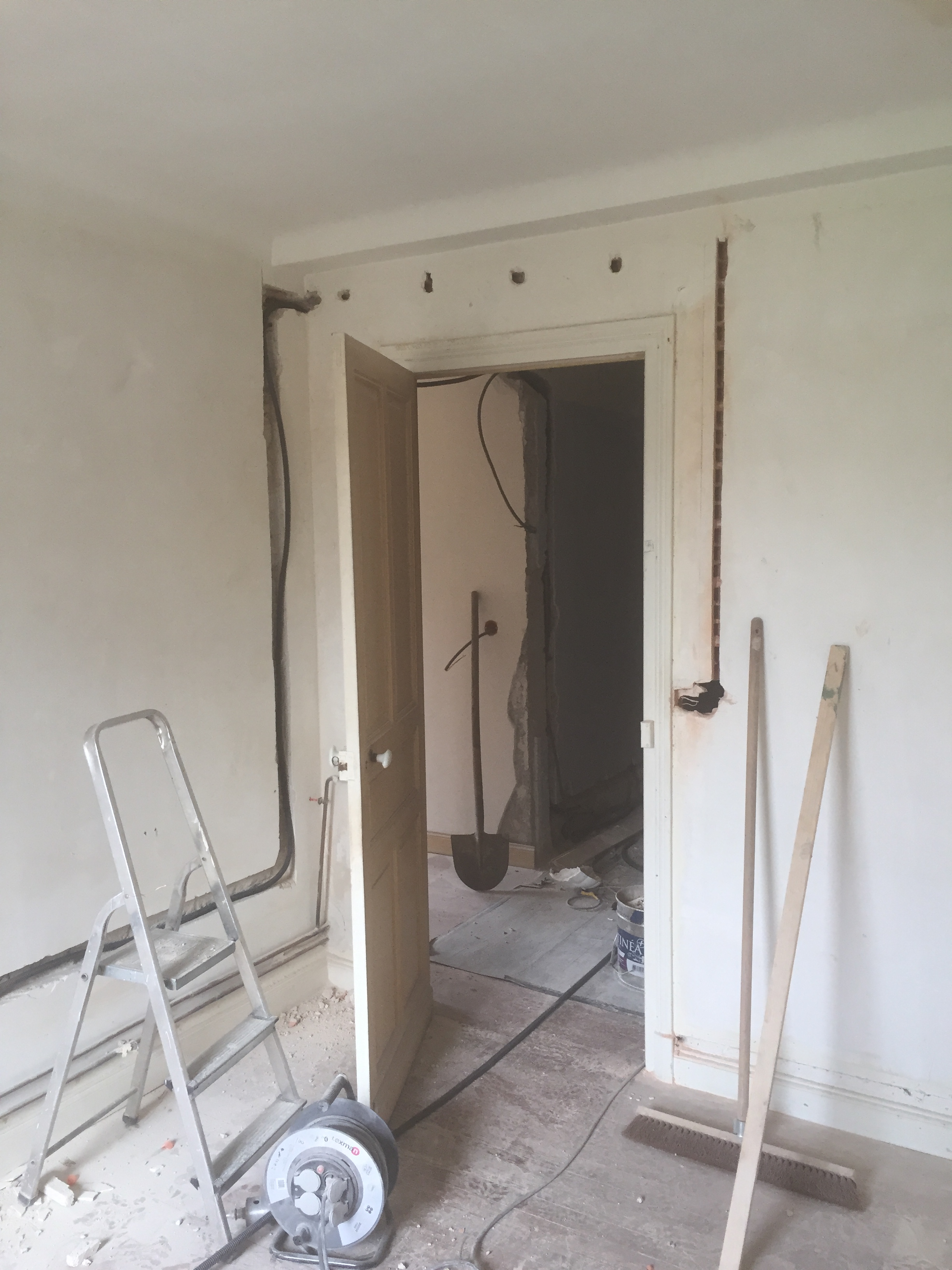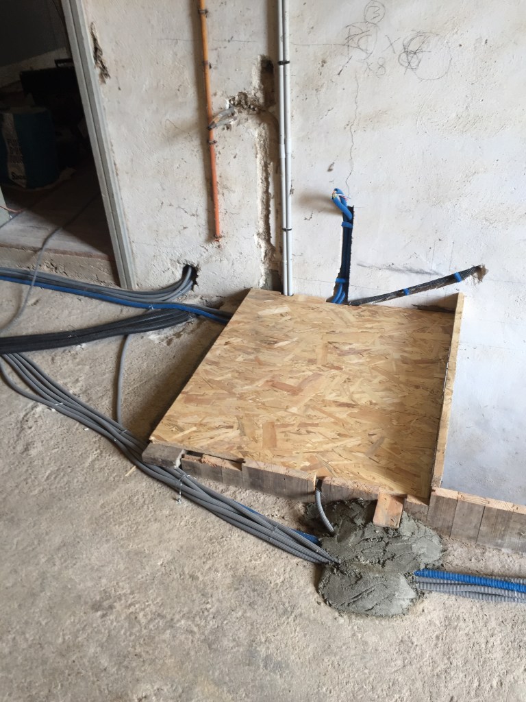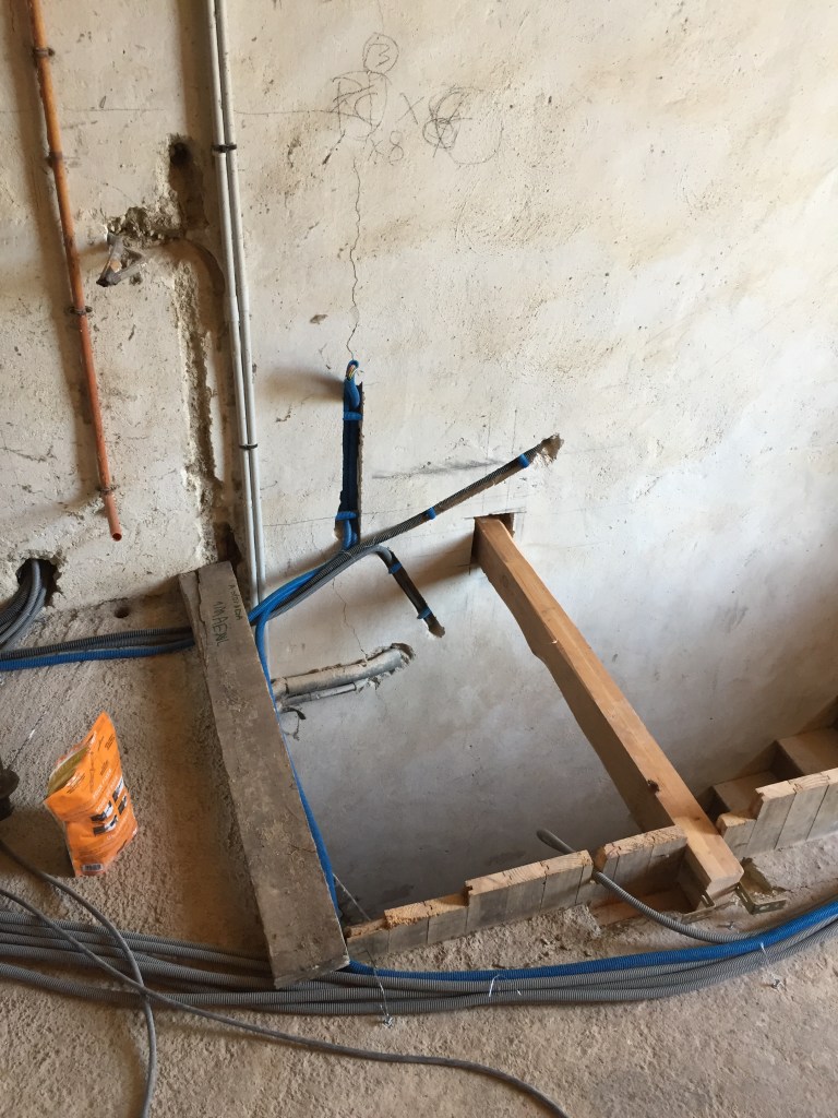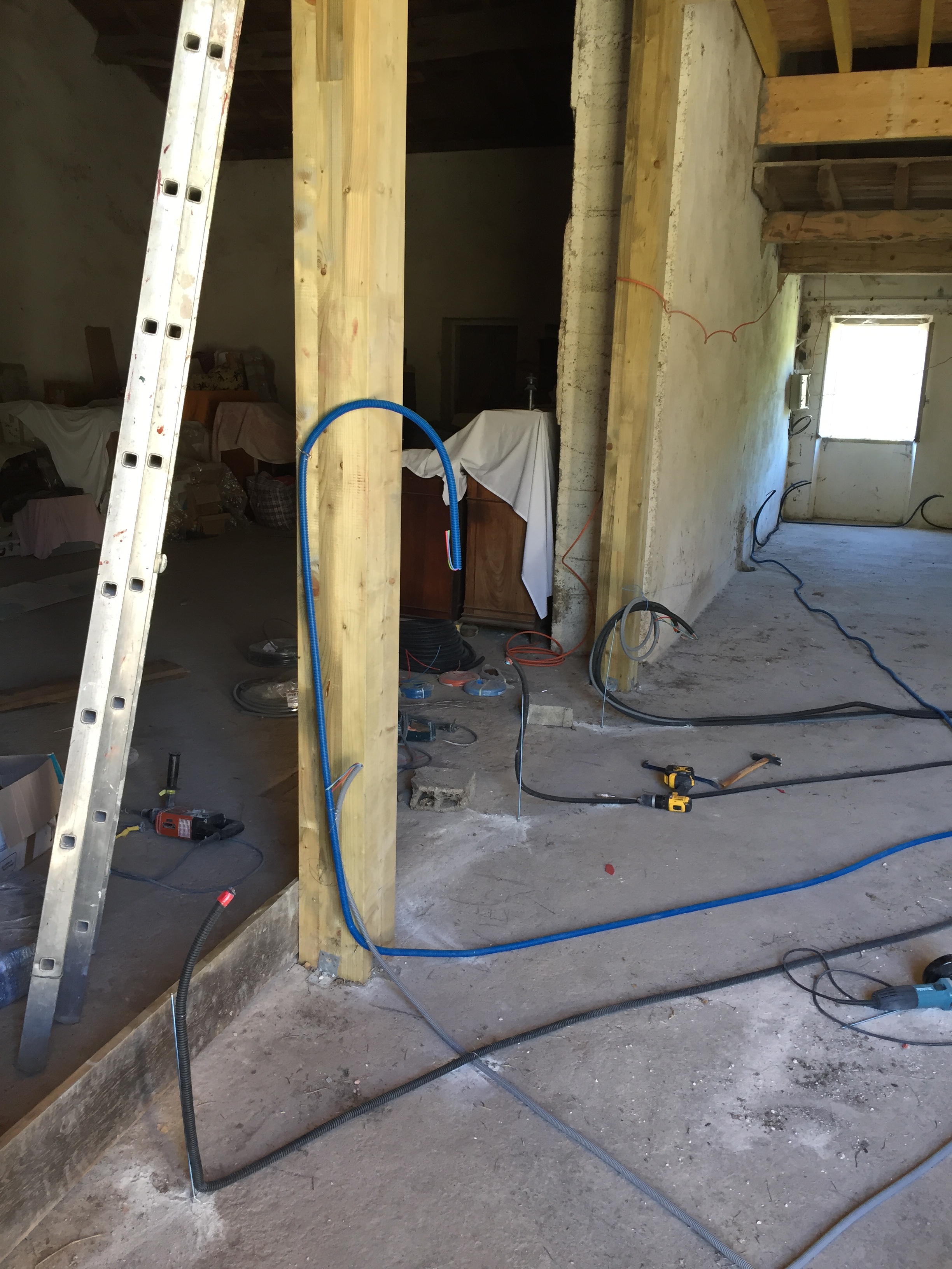 Maintenant que l’électricité est tirée dans les chambres, il faut s’attaquer à notre future salle de séjour et à notre cuisine !