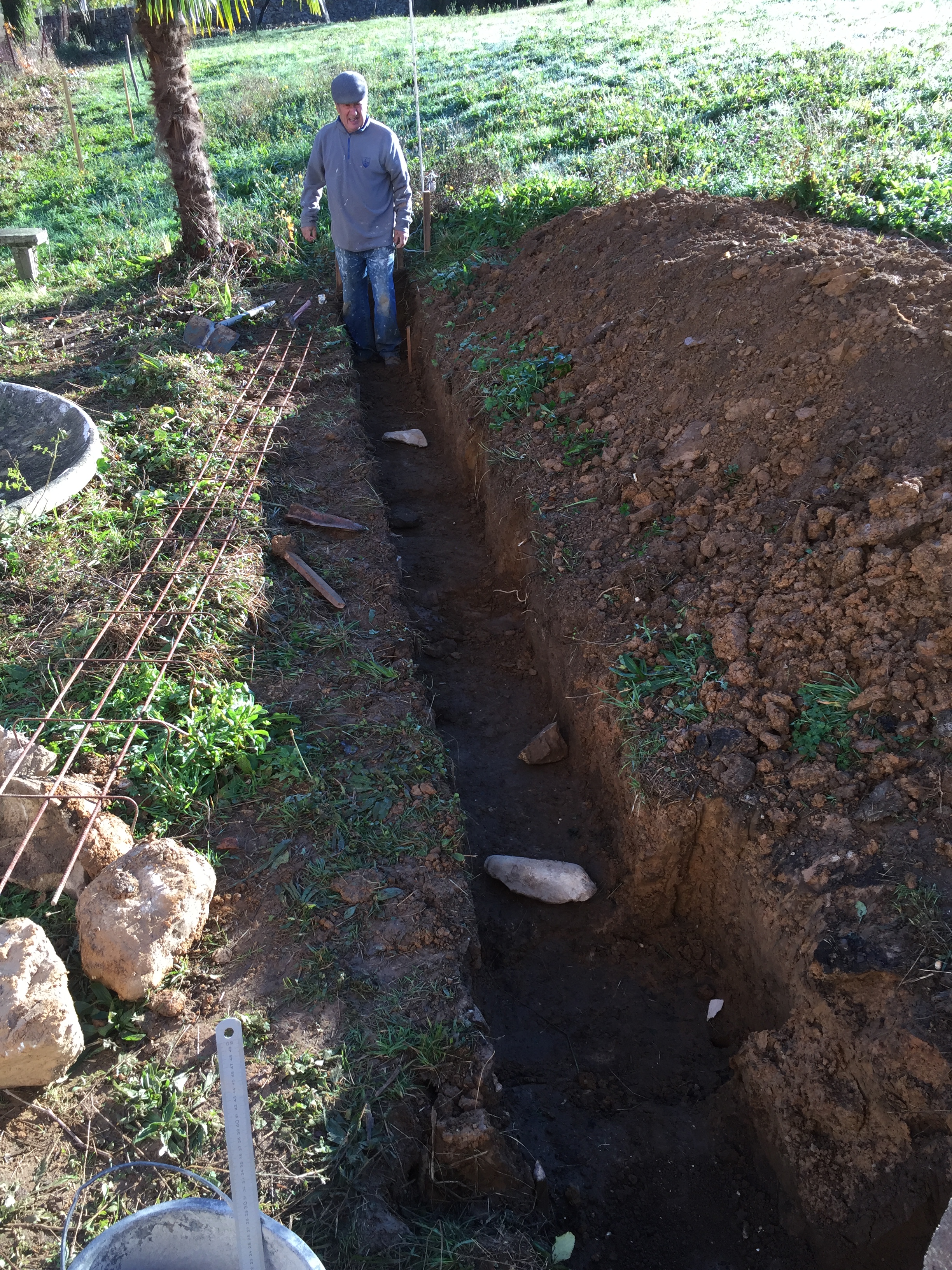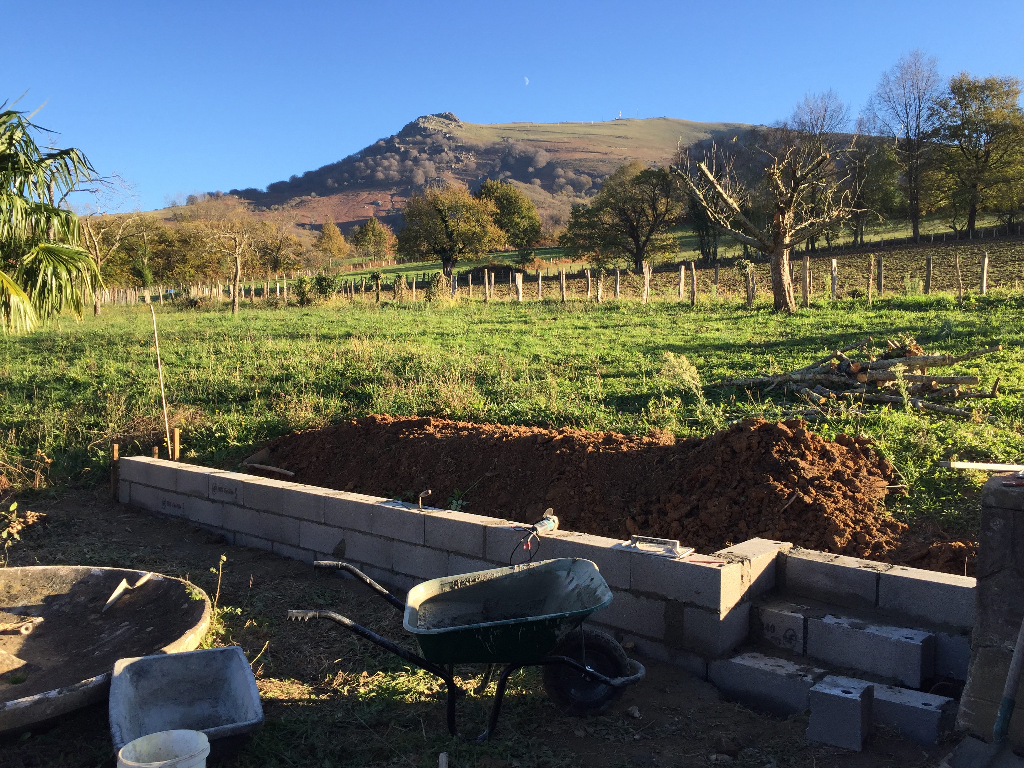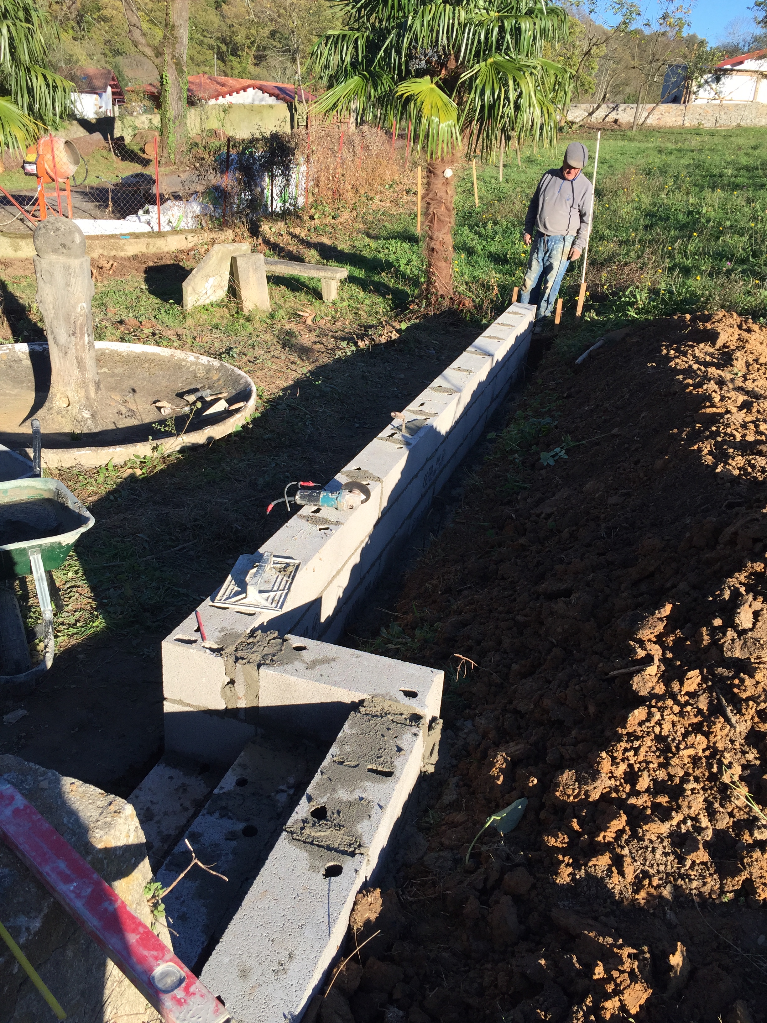 On commence par un muret, pour retenir la terre et pour y appuyer les poteaux de la future pergola !